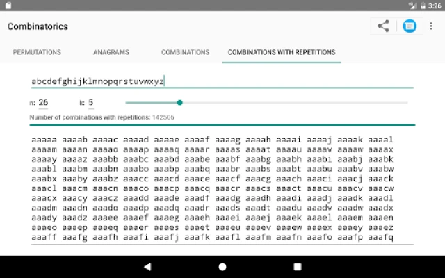 Extra features: * Displays the number of permutations/combinations/... with well formatted mathematical symbols using tex/latex * Ability to share a calculation, for instance to save it to a file or to mail the result * Unicode support, so letters of non latin alphabets and emoticons are also supported * Option to send feedback from within application